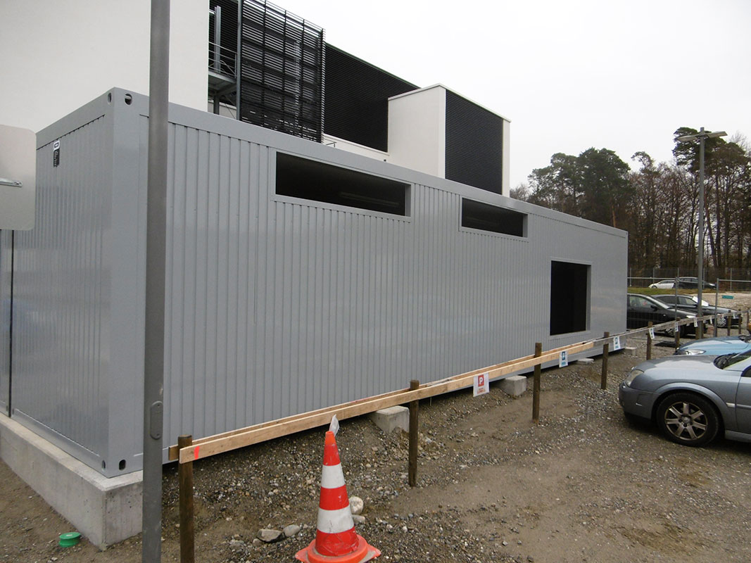 Hier sehen Sie den Aufbau einer Containeranlage. Die modulare Bauweise erlaubt den Aufbau der Container in sehr kurzer Zeit und mit relativ kleinem Aufwand.